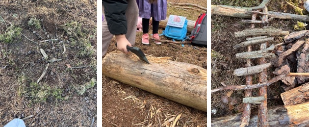 Am zweiten Tag begann der Waldtag mit einem gemeinsamen Frühstück. Heute bauten die Kinder Feenhäuser aus Naturmaterialien und eine Leiter aus Stöckern. Ebenso durften sich die Kinder im Umgang mit einem Beil, unter Anleitung, ausprobieren.