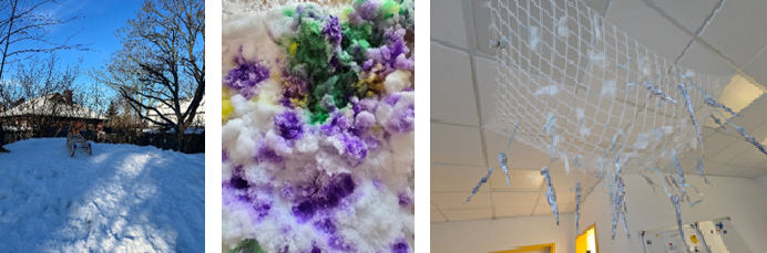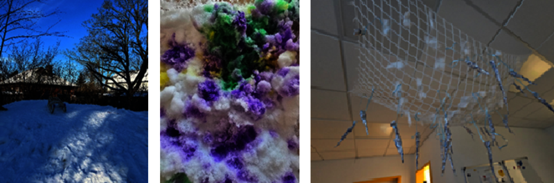 Nun kamen die eisigen Temperaturen und die Kinder konnten an einigen Stellen beobachten, wie Eiszapfen entstehen. Nun wurde der Flur in eine kleine Eislandschaft mit Schneewolken und glitzernden Eiszapfen verwandelt.